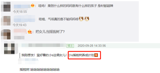 而关于小S女儿做明星这件事,网友们的看法却呈现出了南北极化的趋势。有人认为小S已经在娱乐圈闯出了一片天,现在女儿们进入娱乐圈也能借助妈妈的名气火一把,但也有人质疑小S是因为近几年在娱乐圈发展势头减弱,才将女儿拉出来当钱树子,还有网友直接调侃道:小S在做一个钱树子养成计划。