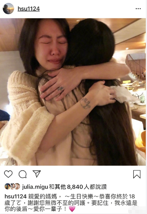 6月14日,在小S过生日时,许曦文还在社交平台示爱小S,并调皮地称小S18岁了,她很感谢小S无微不至的呵护。小S同样是感动到抱着女儿哭泣,母女俩依偎在一路,画面十分温暖。