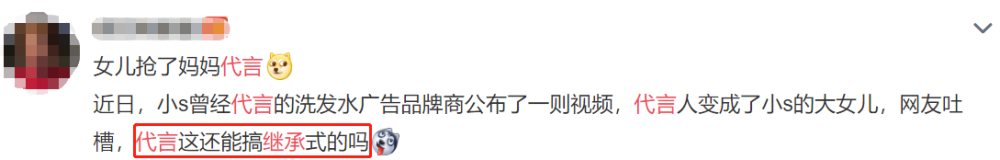 小S为了女儿的成名路也费尽了'心思',前不久,许曦文接力了妈妈小S代言了13年的某品牌,还被网友调侃道,原来代言也是可以继承的。这一波操作不但让该品牌受到了大众的关注,更是将大女儿许曦文更进一步地推到观众面前。