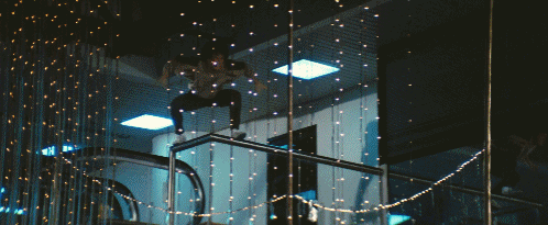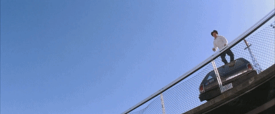 《警察故事》中成龙曾经有从百货公司顶楼跳下来的玩命壮举,这一回成龙又来到了跳楼的位置。