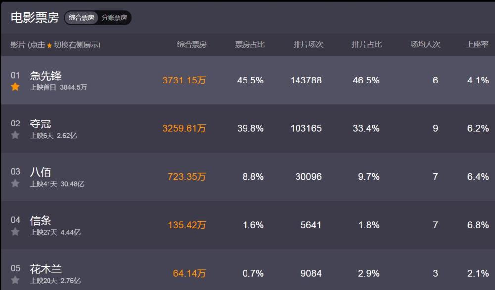 但是就目前的电影票房和口碑来看,显然这部电影还是受到了观众的认可,今日首映的实时综合票房就已经突破了3700万,并成功从上映已经6天的《夺冠》手中暂时夺得单日票房第一名。