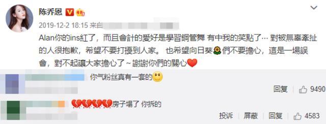 面对网友的质疑,Alan解释关注的美女都是自己的朋友,还对给她们造成困扰致以歉意,可是Alan的接受并没有得到陈乔恩粉丝的谅解,还是反对这段恋情。
