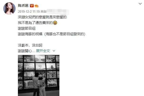 2019年12月2日,陈乔恩和Alan通过网络宣布了新恋情。Alan深情告白陈乔恩,感谢遇到了彼此,陈乔恩也感慨爱情没有放弃她。可是俩人的结合,却并未得到粉丝的祝福。