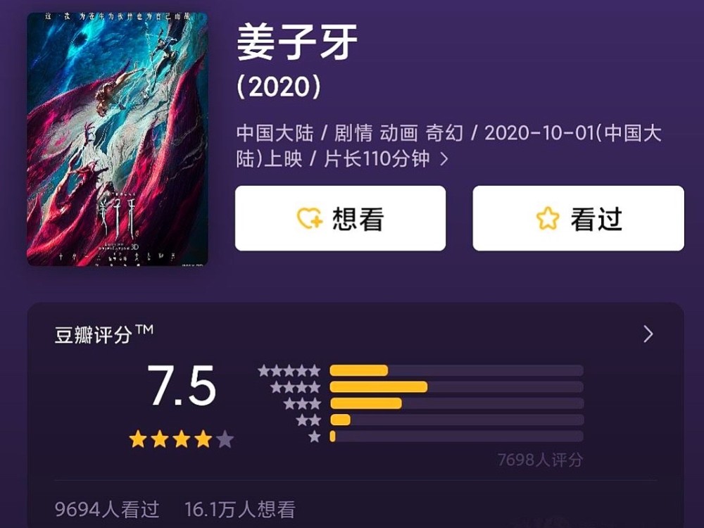 整部电影的动态元素很多,且都具有必然的特色之处,如我们一向在追求的中式美感一样!虽然剧情和人气可能是他必然的短板,但是在《姜子牙》中,我们明显能发现台词相较于哪吒来说下了功夫,而同样的配乐也是!特别是周深给大家带来的片尾曲,声音仿佛注入了灵魂,让人不由再一次膜拜!看着国漫这样的变化,心里满是骄傲,这样的国漫了不得!