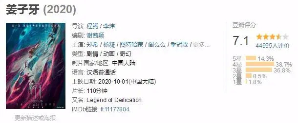 在口碑刚解禁之时,《姜子牙》的评分为7.5分,但在24小时之内,却直接跌到了7.1分,评分人数已超4.4万人,就目前趋势来看,基本可以确定会继续下跌,口碑成绩完全低于预期。