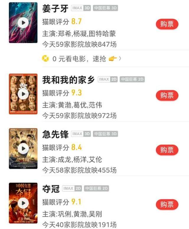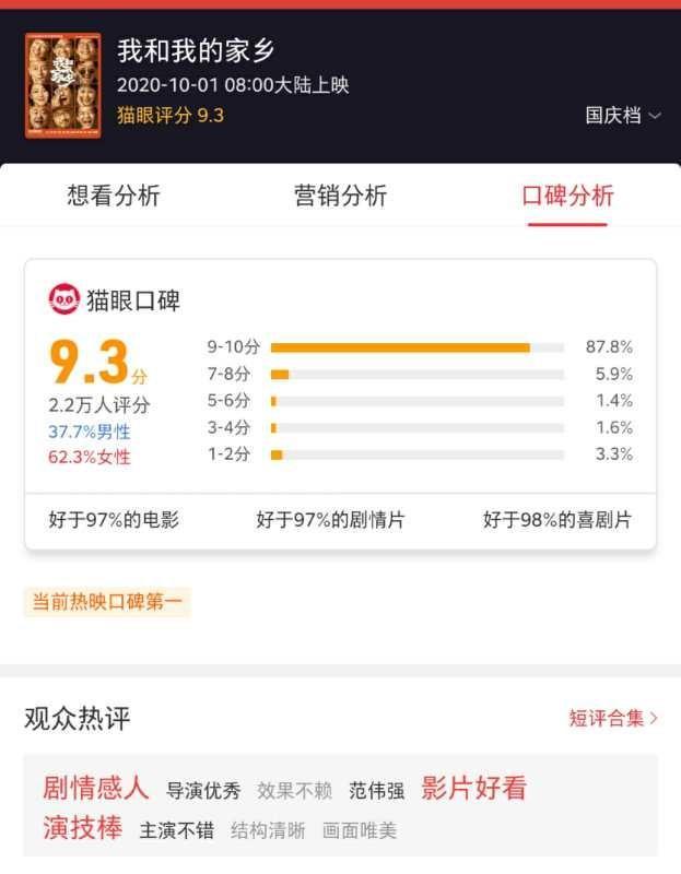 10月1日,电影《我和我的家乡》迎来首映,上映首日票房已突破2亿,猫眼评分高达9.3分,为国庆档评分第一。