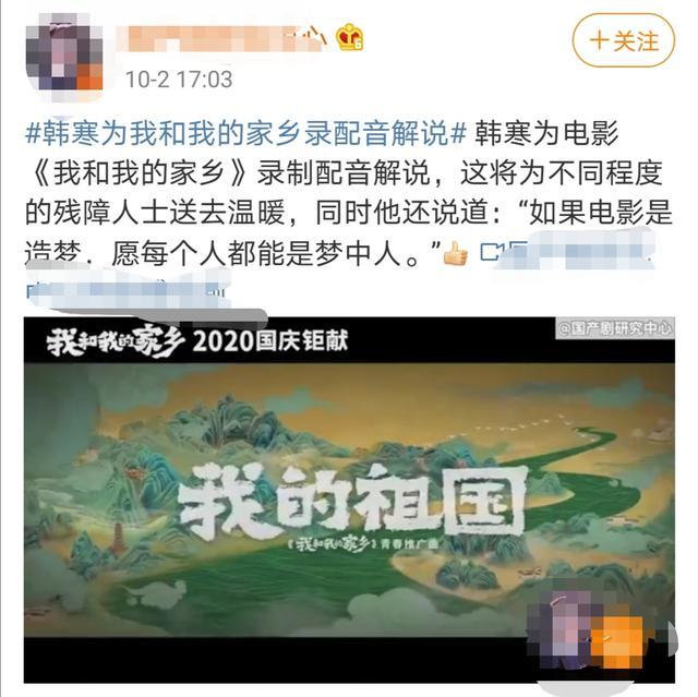 《我和我的家乡》还将温暖给予残障人士,10月2日,韩寒自曝为《我和我的家乡》录制了无障碍版本的配音解说,称'如果电影是造梦,愿每小我都能是梦中人。'令网友为之动容。