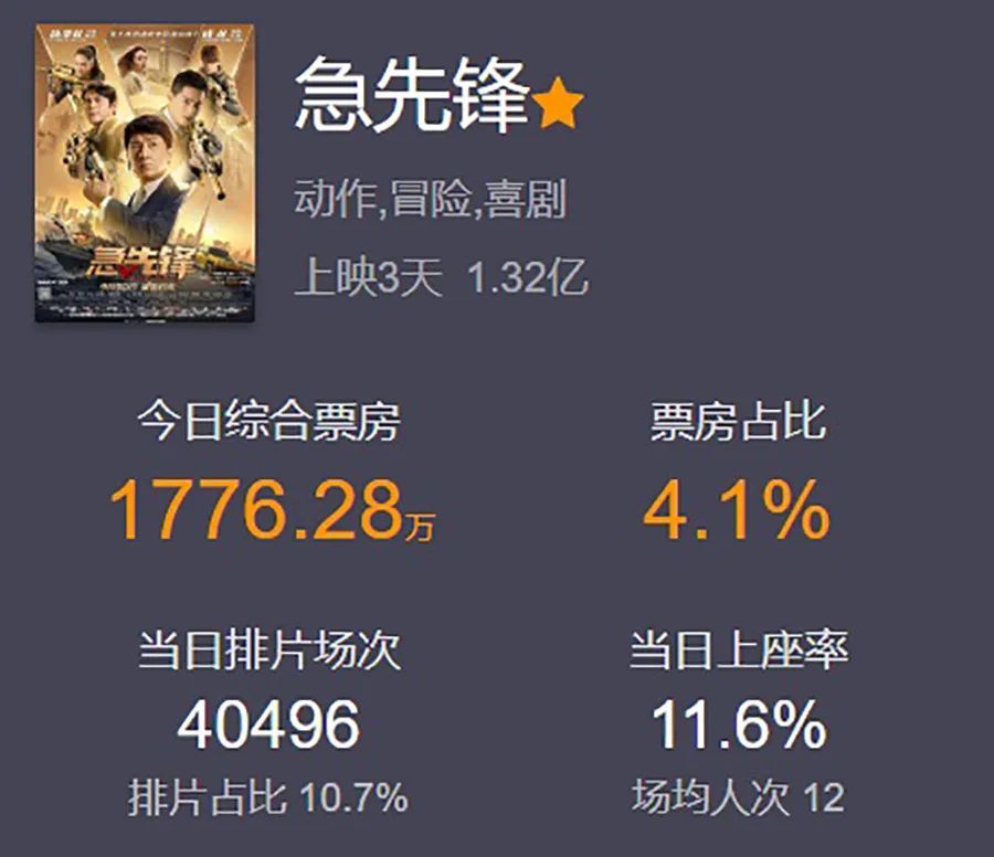 但是,有人欢喜就有人愁,纵使在票房榜上位列3、4位,但后两者的实际表现并不睬想,尤其是成龙的新片《急先锋》,目前上映3天,总票房实时数据才1.32亿。