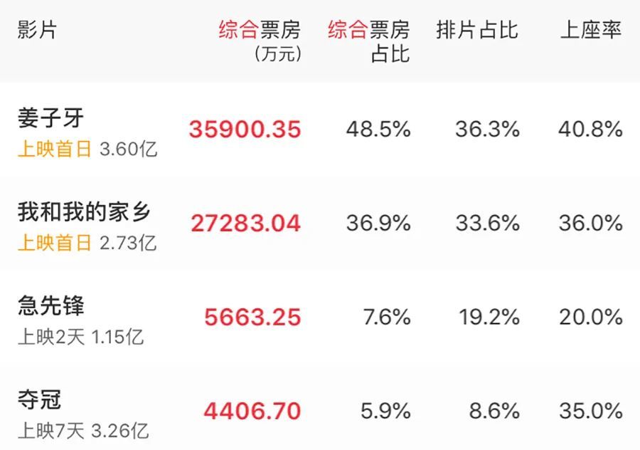 《姜子牙》、《我和我的家乡》、《夺冠》、《急先锋》,这4部阵容豪华、制作强大的新片无疑是贡献最大的作品,而最大的赢家当属前两者,单日票房分别拿下3.59亿和2.72亿,占比高达85%。