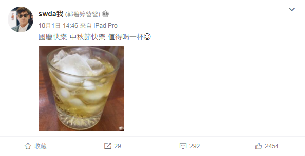 10月1日,是台媒报道的郭碧婷产女的时间,郭爸这天下昼还在悠然地喝着小酒,在社交软件上分享照片,同时庆祝双节快乐。
