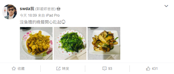 这天晚上,郭碧婷爸爸如往常一样,分享了自己当天的平淡晚餐,文案也是平平无奇,看不出是刚得了外孙女的样子,只说自己要开心地吃晚餐。
