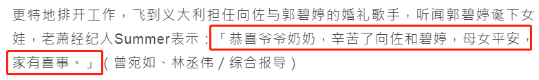 媒体报道称,向华强干儿子、郭碧婷与向佐的共同好友萧敬腾也在第一时间通过经纪人Summer送上祝福:“恭喜爷爷奶奶,辛苦了向佐和碧婷,母女平安,家有喜事。”