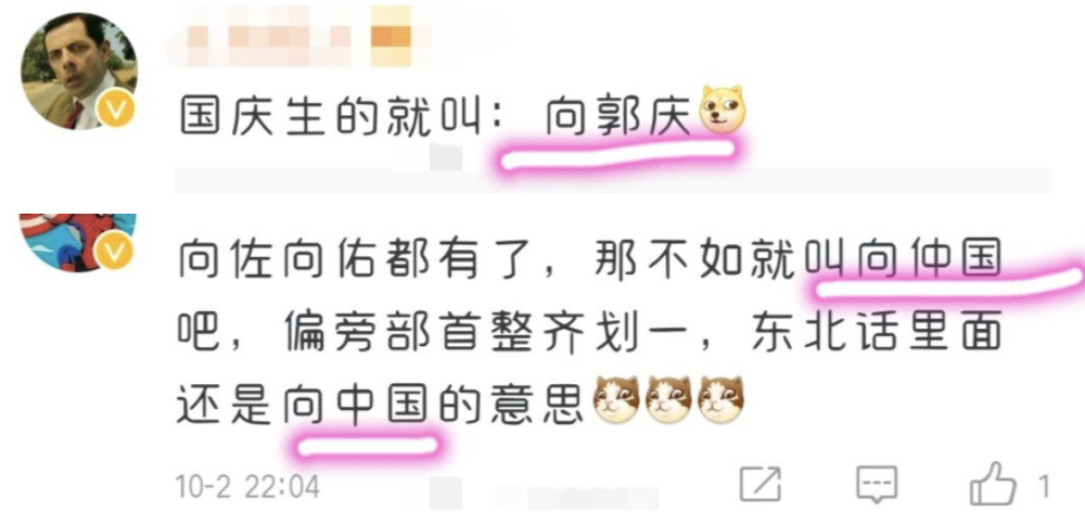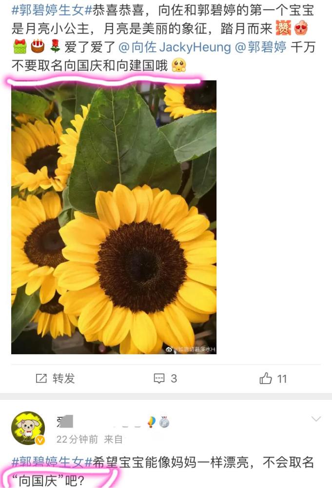 因为宝宝是在国庆节出生的,网友建议宝宝取名叫“向郭庆”,分别用了向佐和郭碧婷的姓氏,组合起来也正好和国庆节谐音一致。还有人说,因为向太为儿子取名为“向佐”“向佑”,给孙女取名为“向仲国”,这样东北话就是向中国的意思,和国庆节的意义也很一致。