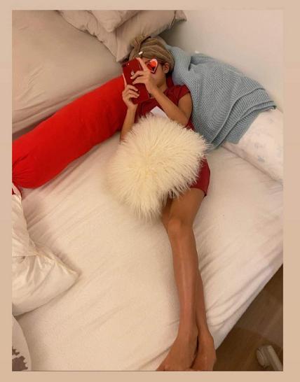 照片中,Grace穿着一身红色短裙,头戴速干巾,眼睛上还戴着一副爱心墨镜,可爱俏皮,但Grace浑身最惹人注意的莫过于她的一双逆天大长腿。
