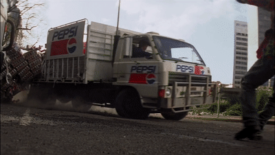 从敌营逃脱后,成龙的车队撞翻了一辆运送矿泉水的卡车。