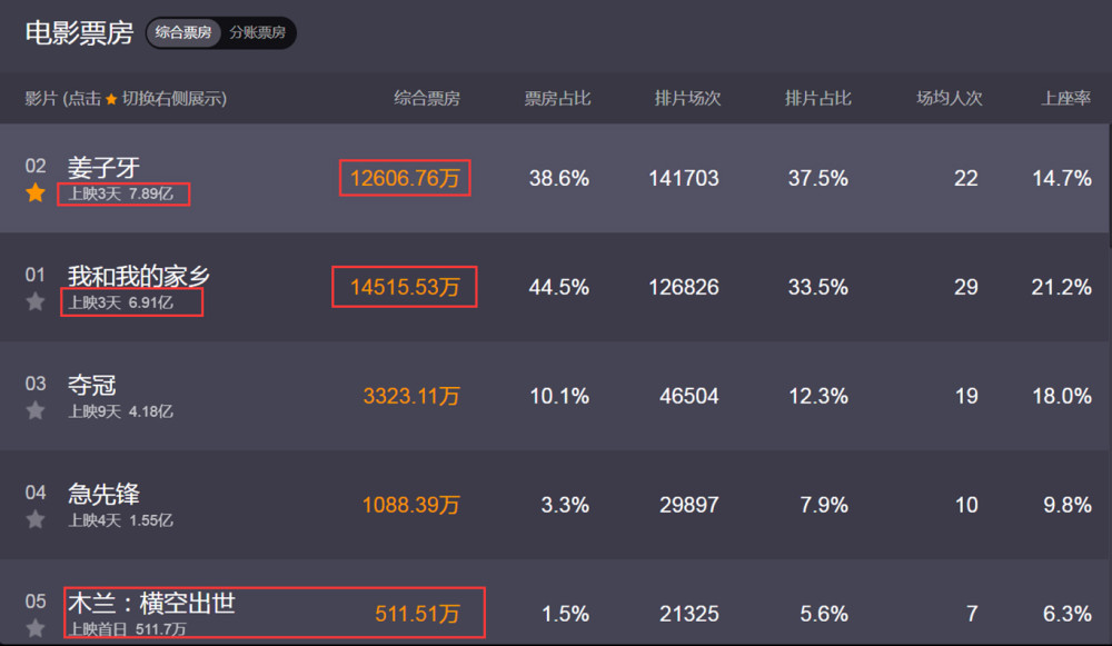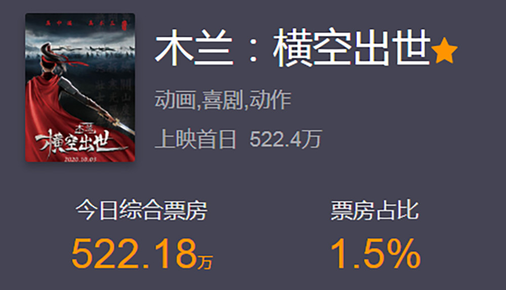 《木兰:横空出世》的排片率要远远低于《姜子牙》、《家乡》等电影,作者在购买电影票的时候,发现一些小影院根本都没有排片,或许是受到排片率的限制,或许是官方为了避开竞争最为激烈的国庆档前两天,《木兰》选择了在国庆第三天上映。但即使是避开了厮杀最为惨烈的时间段,《木兰》依旧是不叫好也不叫座。