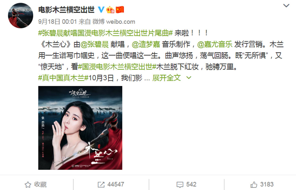 而在上映前夕,官方并没有对《木兰》的内容做重点宣传,而是将宣传的重点又放在了由张碧晨演唱的片尾曲上。相比《姜子牙》换了又换,层层递进的宣传海报,《木兰:横空出世》从头至尾只有一张海报。这样的宣传让人不由怀疑,《木兰》可以宣传的,只剩下主题曲和片尾曲了么?