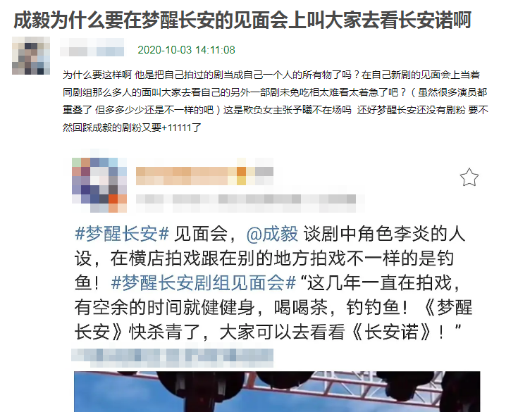 然而这些都是其次,在成毅的发言中,他还提到《梦醒长安》很快便会杀青,大家可以去看看《长安诺》,公然在见面会上提及别的剧,虽然依旧是他主演,但这样的发言还是挺让观众反感的。