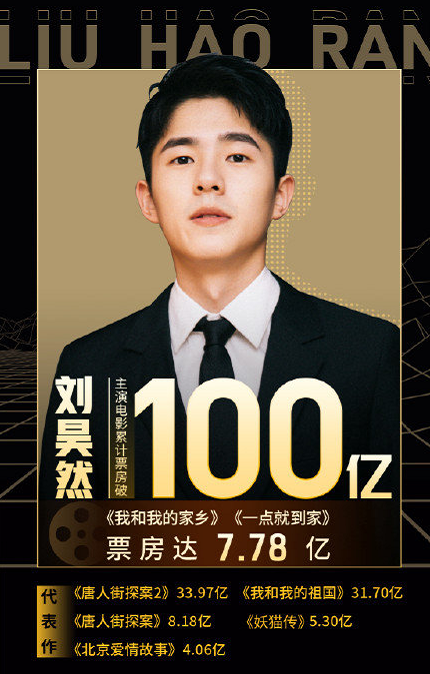 第二位百亿票房演员是刘昊然,目前的小我总票房是102亿,是入围中国百亿票房演员中年纪最小的,同时也是票房最少的一名。