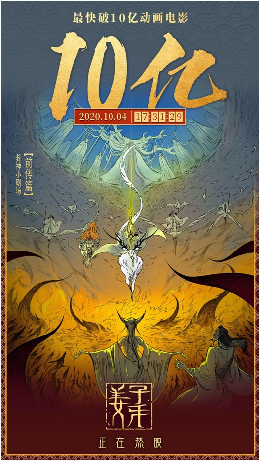 猫眼专业版数据显示,截至10月4日五点半左右,2020年国庆档的两部热门影片《姜子牙》、《我和我的家乡》累计票房双双突破了10亿元,点燃市场热情。其中,《我和我的家乡》后发先至,率先突破10亿大关;而《姜子牙》刷新了《哪吒之魔童降世》的记录,成为中国影史上票房最快破10亿的动画电影。