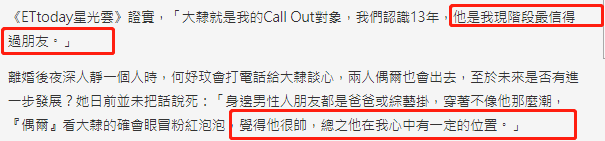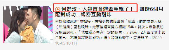 新恋情传出后,何妤玟回应坦白与对方相识13年,但是却未承认恋情,只说对方在她心中有必然分量。10月5日,据台媒报道,何妤玟当众在节目中认爱大隶,两人不但在舞台上成功牵手,还当众甜蜜亲吻,引起网友关注。