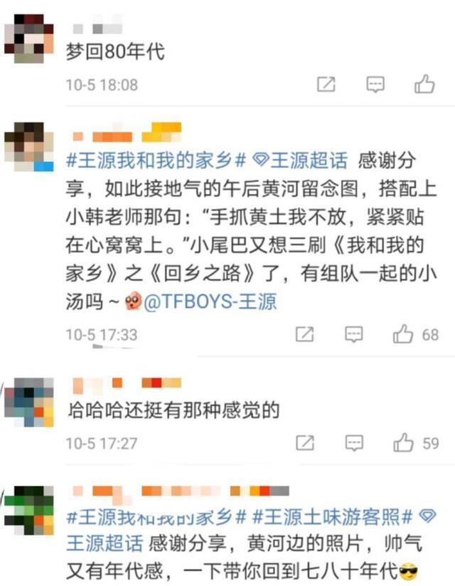 有网友表示这一组图片也想到了王源在电影中饰演的角色'小韩老师'的经典语句'手抓黄土我不放,紧紧贴在心窝窝上'。还有网友表示'梦回80年代,既帅气又有年代感','像极了爸妈的朋友圈'。