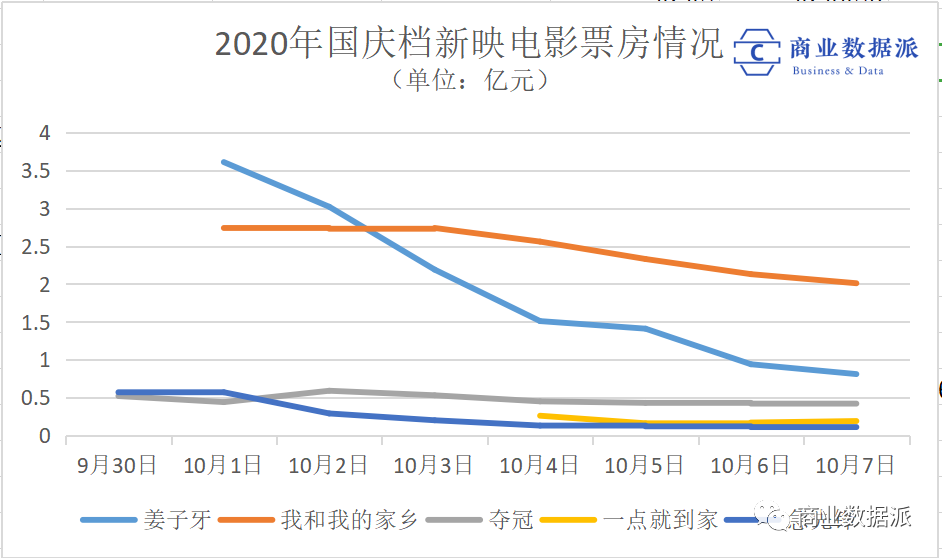 一是因为支流观众进入假期空暇时间,二是因为10月1日当天有《姜子牙》和《我和我的家乡》两部重量级新片上线。这两部电影在1日便共计创下了6.35亿的票房,占当日总票房的85.6%。