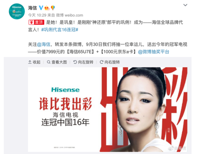 就像今年国庆档的另一个赢家——海信一样,同样有着业内十几年冠军头衔,同样是家喻户晓的品牌符号,海信在电视圈也是冠军的存在。就在这次巩俐靠《夺冠》再次大火之际,海信向巩俐抛来了橄榄枝,邀请巩俐作为海信的全球品牌代言人。