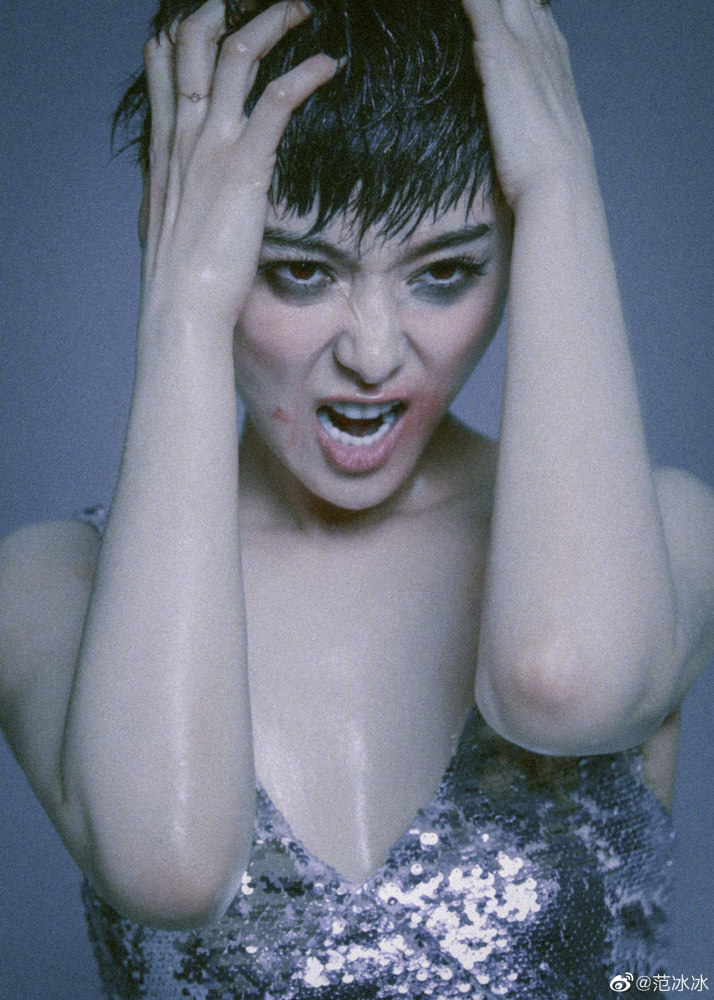 其中,最中央的一张照片,一会儿吸引到了大家的注意。照片的范冰冰,头发湿润,眼妆和唇妆都被破坏,不再精致,双手抱头,神情似呐喊状态。让人看着有种范冰冰要突破常规的感觉,以及表达了她对生活的咆哮和呐喊,想要说出自己的心声,向大家大声的喊出自己心中的声音。