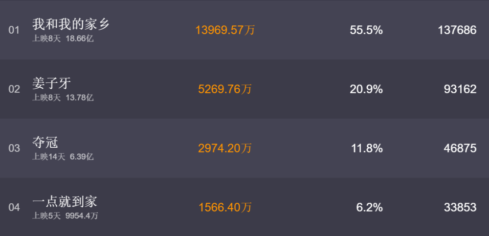 现在国庆假期已经结束,至于《我和我的家乡》以及《姜子牙》等两部作品的较量也有了一个明显的差距。