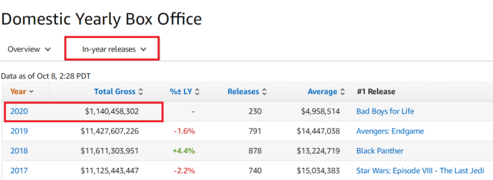 截至10月8日,北美2020年总票房 图片来源:Box Office M