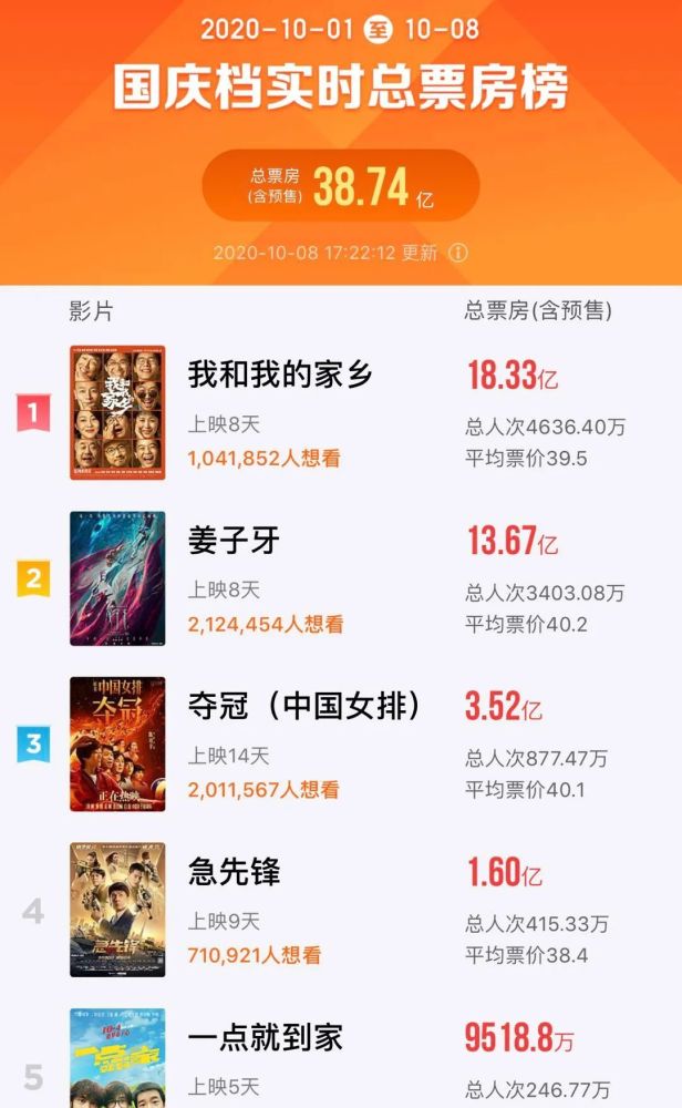 据灯塔专业版数据,截至10月8日17时22分,国庆档的总票房近40亿元,其中众星云集的《我和我的家乡》以18.33亿元的票房领跑大盘,《姜子牙》紧随其后,票房达到了13.67亿元,9月25日抢先上映的《夺冠》目前累计总票房6.34亿元,由成龙主演的动作片《急先锋》总票房刚过2.18亿元,10月4日错峰上映的《一点就到家》票房0.95亿元。