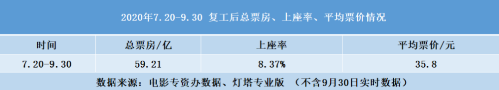 灯塔专业版数据显示,7月20日到7月26日影院复工首周,总票房突破一亿。复工第二周,7月27日至8月2日,全国票房近2亿元,复工率约60%,恢复迅速。复工两个多月后,7月20日~9月30日,大盘总票房累计近60亿元,上座率为8.37%,平均票价为35.8元。相比之下,2019年同一时期大盘票房为130.19亿元,平均票价35.4元。