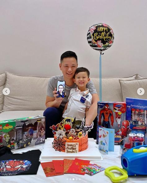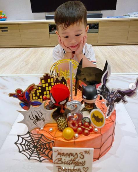 照片中的奕霆仔很是开心,他面前摆放了有蜘蛛侠、蝙蝠侠装饰的橙色生日蛋糕。还有各类男孩子最爱的玩具,让他开怀大笑,爸爸拍照的时候他也非常配合。
