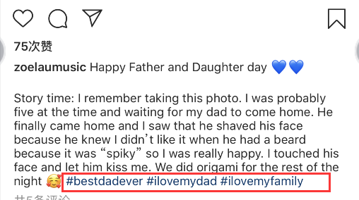 刘秀盈的标签中还大方表白刘銮雄“best dad ever(最好的父亲)”“i love my dad(我爱我的爸爸)”“i love my family(我爱我的家)”,言语中尽显父女温情,还有一家人的幸福。