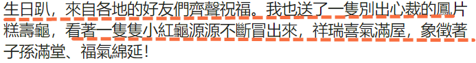 据白冰冰透露,她送出了当晚一只别开生面的凤片糕寿龟,“看着一只只小红龟源源不竭冒出来,祥瑞喜气满屋,象征着子孙满堂、福气绵延”!如此场景和有心,相信林金花当然非常的高兴。
