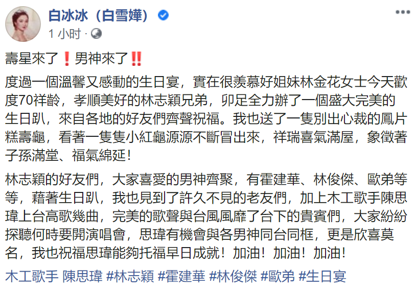 10月11号深夜,艺人白冰冰在社交网上晒出一组照片,并留言说道:“寿星来了!男神来了!度过一个温馨又感动的生日宴,实在很羡慕好姐妹林金花女士今天欢度70祥龄,孝顺美好的林志颖兄弟,铆足全力办了一个盛大完美的生日趴……”。
