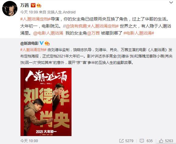 但是结合万茜的微博来看,《人潮汹涌》或许不只是刘德华饰演的角色和肖央饰演的角色互换身份,似乎万茜饰演的角色也参与到了互换大戏中,这相比《羞羞的铁拳》男女主互换身体的情节来说更复杂了。