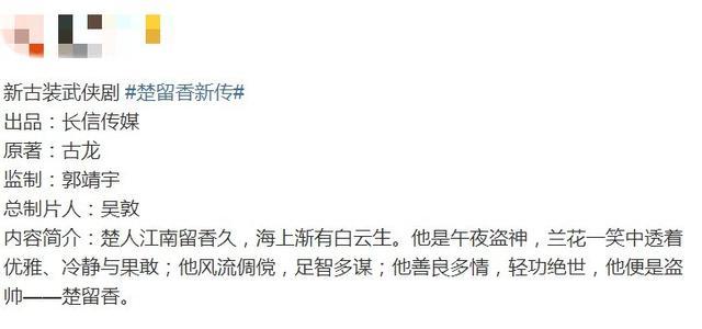 而继以上两部武侠剧以后,郭靖宇又要迎来最新作品了。郭靖宇监制,《楚留香传》也要拍了,武侠剧四部曲强势来袭!古龙先生的作品翻拍比起金庸而言,倒是少了很多。并不是说作品不敷经典,而是古龙先生创造的侠之大者、快意江湖很是独特化,也很难被模仿与翻拍。所以得知郭靖宇继《绝代双骄》后,再次拍摄古龙作品,也令不少网友非常期待了。