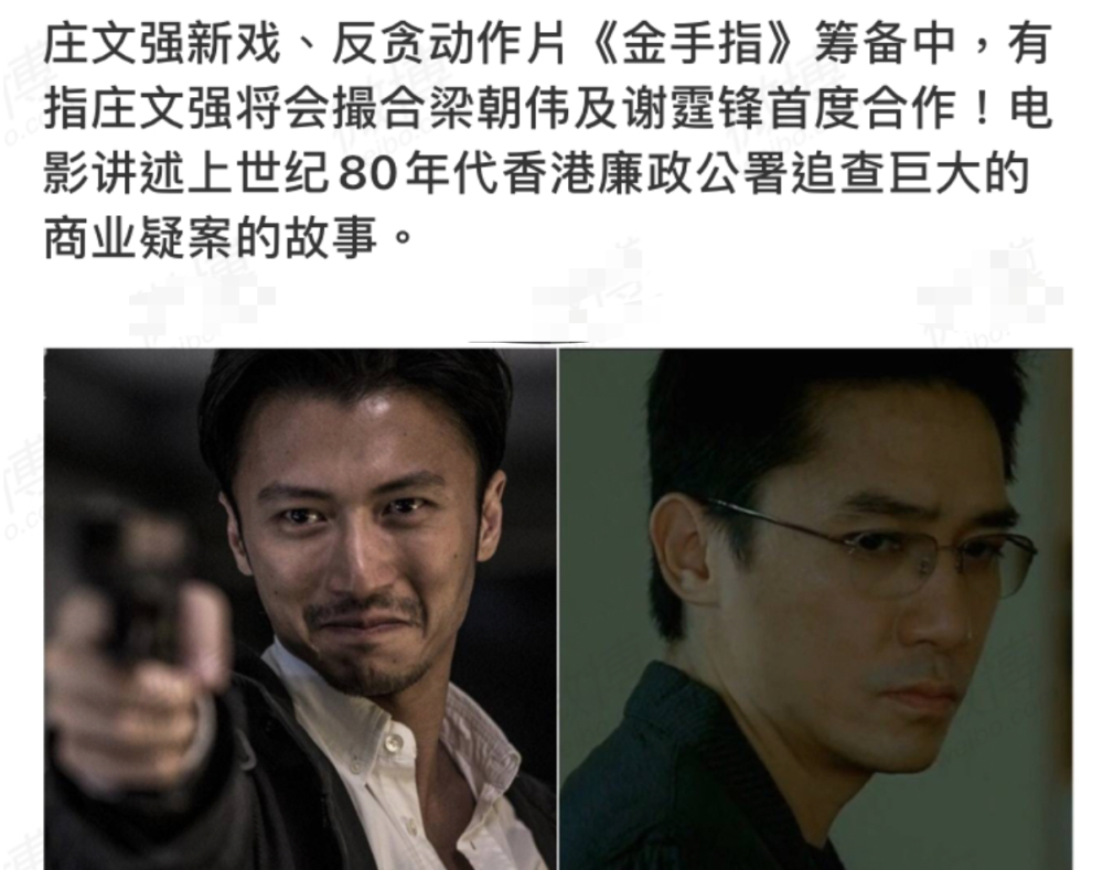 近日,庄文强的新电影《金手指》正在备案中,网传庄文强将启用两个超大牌明星,谢霆锋和梁朝伟,这两名香港著名男星虽然听起来应该很熟的样子,但是两小我竟然在此之前从未合作过。