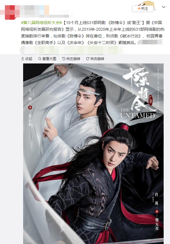 在不久前出炉的《中国网络视听研究发展报告》中,共统计了近18个月来的网络作品,高达631部,在这631部差别的作品中,《陈情令》成功位列第一,超过了近一年半的所有网络作品,足以见出其实力。