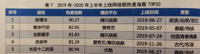 广电官宣19-20上半年网剧指数,《陈情令》1,《全职》3,《时辰》5。
