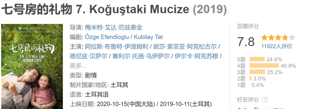 大家哭声一片、泪水涟涟地给这部片打出了8.9的高分,送它坐上豆瓣top100的高位。 七年后,土耳其翻拍了这部电影。今天我们要聊的就是这部土耳其版《七号房的礼物》。