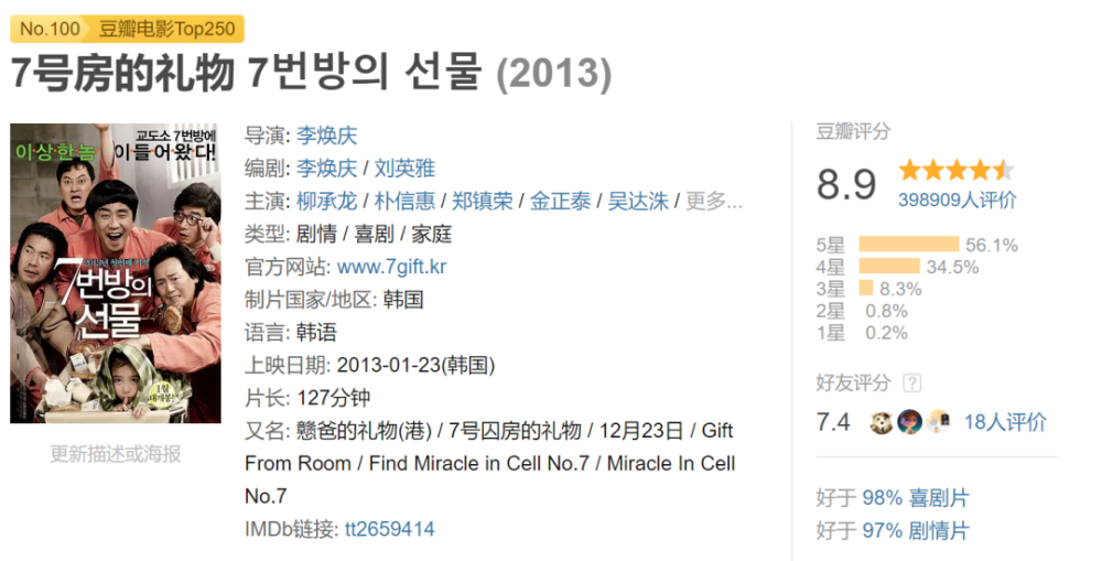 七年前,韩国电影《七号房的礼物》赚足眼泪,拿下韩国电影青龙奖最佳男主角、荣获百想艺术大赏最佳编剧和韩国电影大钟奖最佳男主角。在豆瓣上,这部电影有将近40万人打分,90%以上的观众给出了四星以上的评分。
