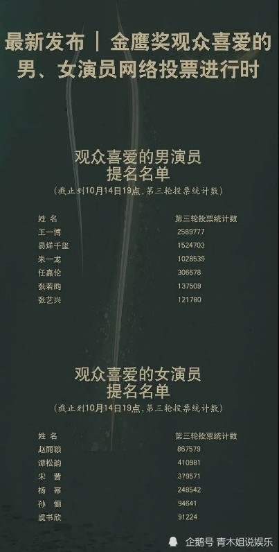 金鹰奖截至10月14日第三轮“观众喜爱的男女演员”投票结果