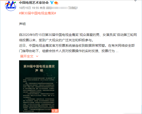 10月15日晚,中国电视金鹰奖方发布声明称检验出了刷票行为,因此决定剔除不正常数据,并且发布了清票后的有效数据。