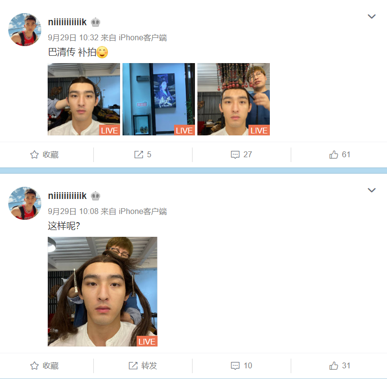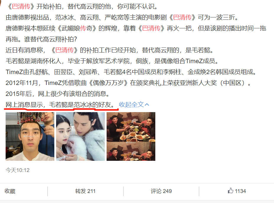 事实上,最先曝出《巴清传》补拍的,也正是毛若懿本人。上个月,他就在小号中晒出补拍《巴清传》的花絮照并配文:“巴清传,补拍”,也正是因为这条微博,才引发了遮天蔽日的报道。