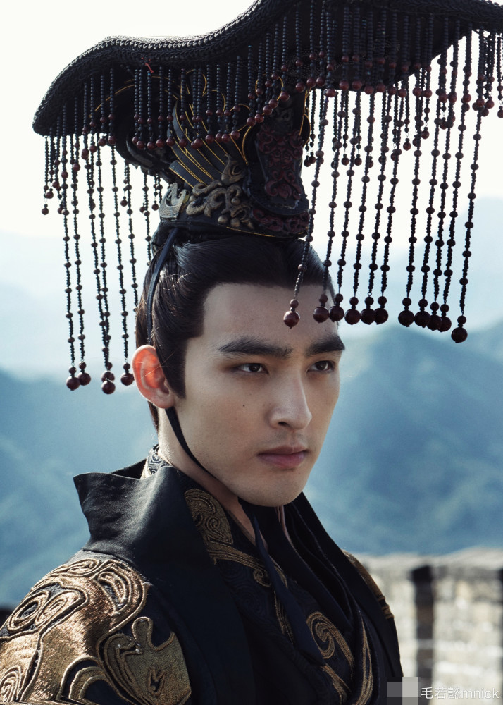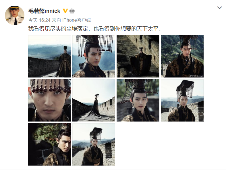毛若懿分享的海报造型正是头戴垂珠帽子的嬴政的造型。