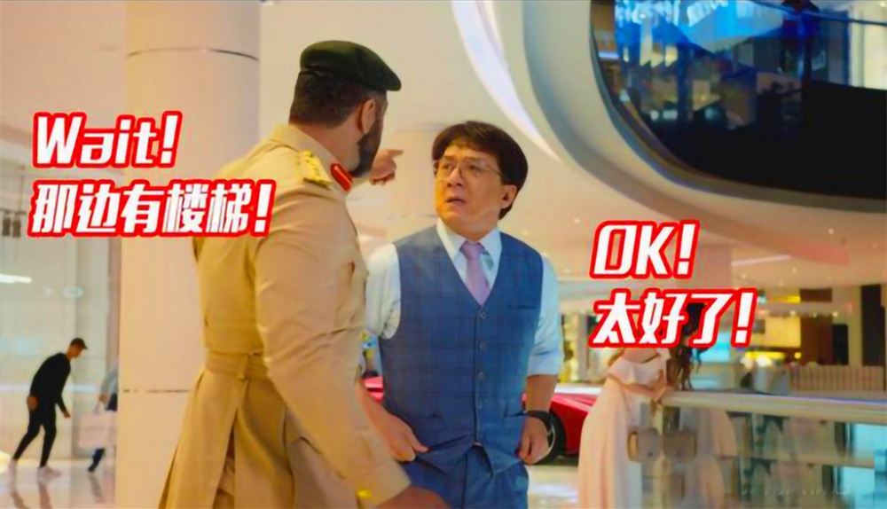 后面杨洋还开着跑车追击坏人,然后为了快速救人,杨洋从楼上跳了下去,成龙看到后撸起袖子准备跳,迪拜警察说“那边有电梯”,成龙说“OK,太好了”,这句话似乎是一个时代的终结,以前成龙下楼都是各种旋转跳跃,根本视楼梯为无物,如今开始坐电梯了;