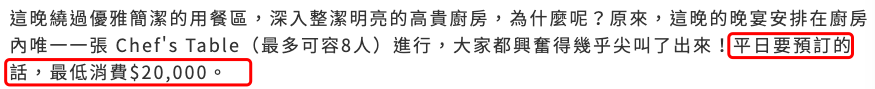 但若是想吃上温有成亲自做的饭菜,还得提前预定。主厨餐桌每晚只接待一桌,最多可容纳8人,最低消费在2万港币(约合钱1.73万元)。果然,明星们的消费水平就是不太一样。